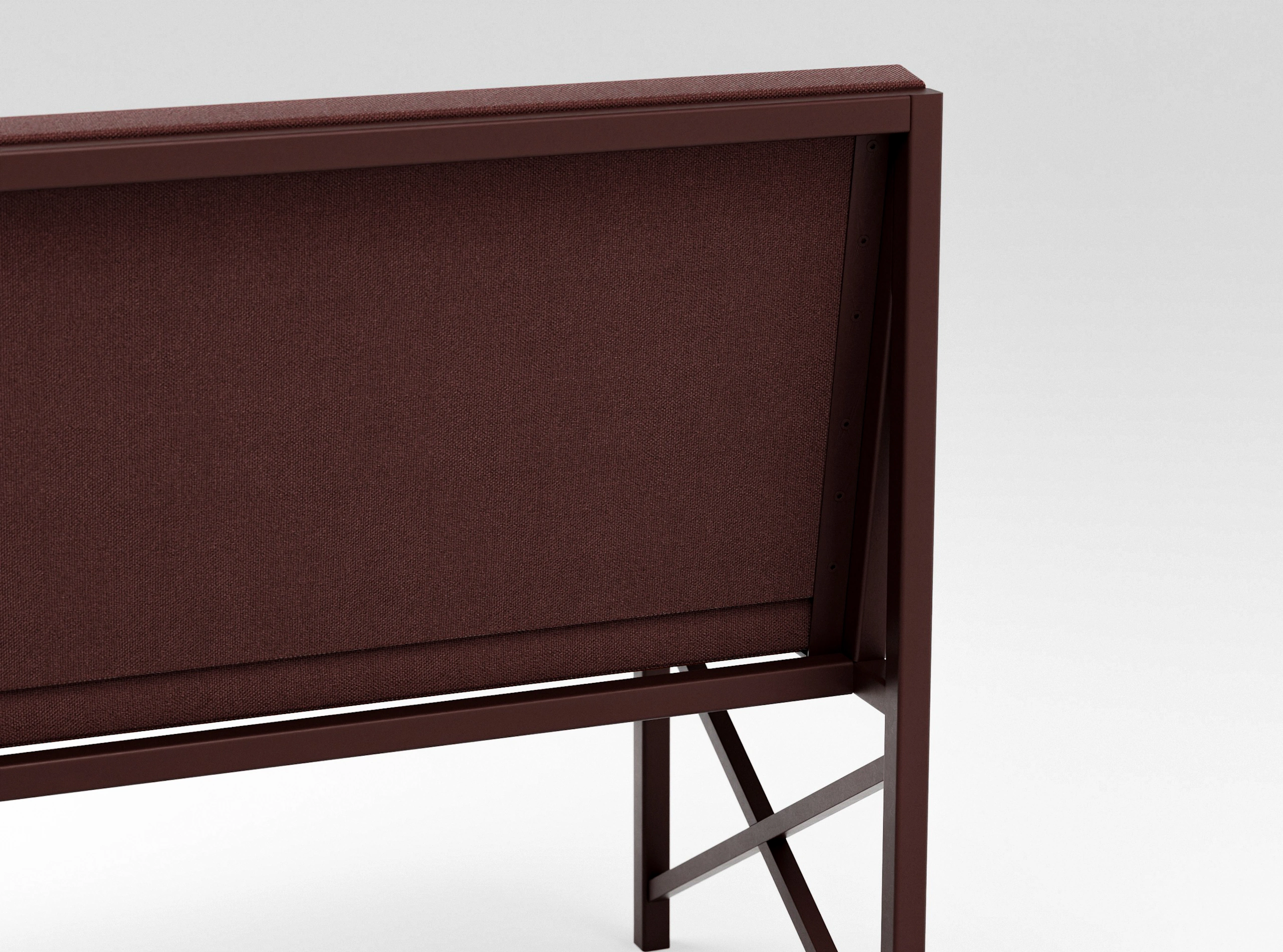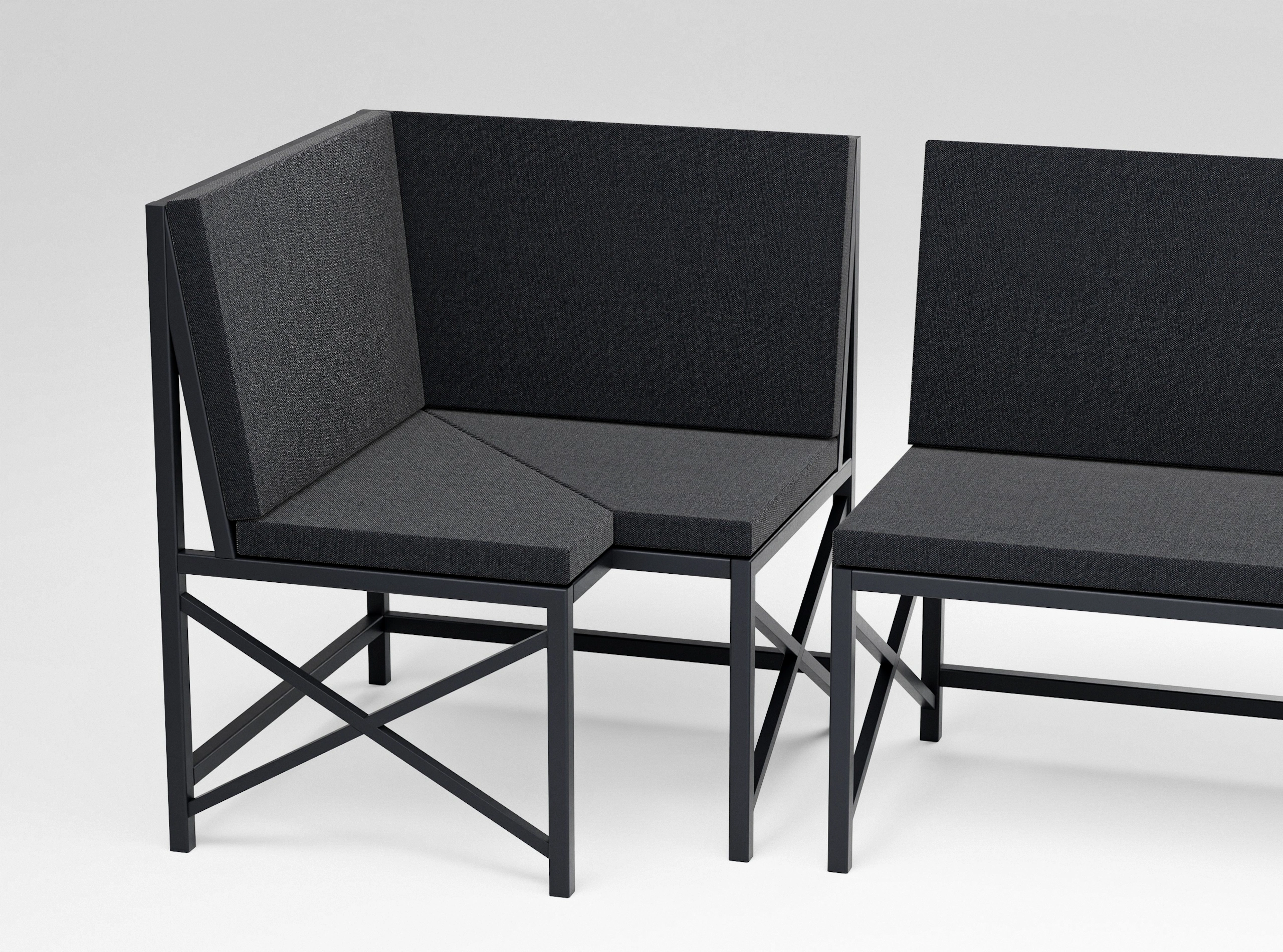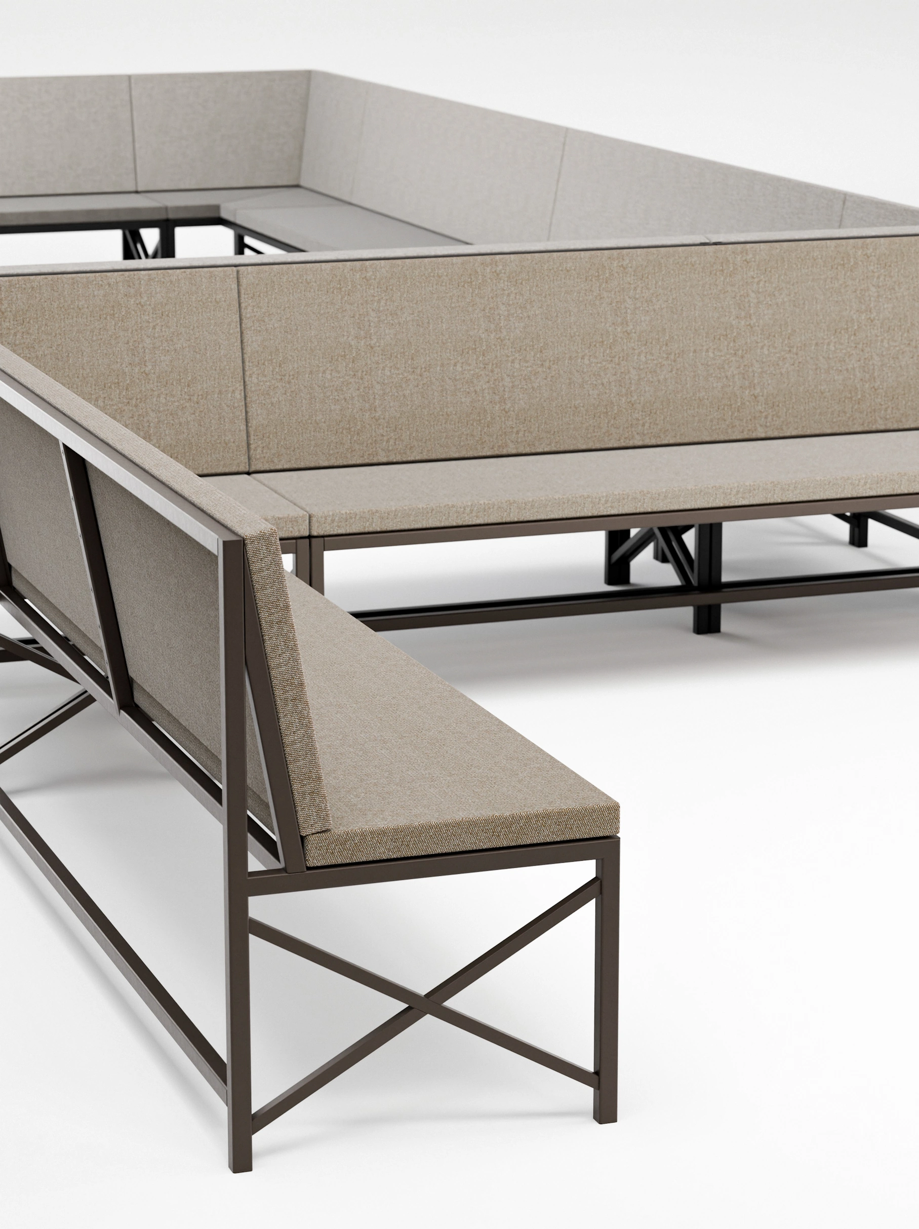 Voor de collectie van Bakermat is een modulair bank systeem ontworpen met een herkenbaar X frame. Het systeem is in laag en hoog verkrijgbaar.