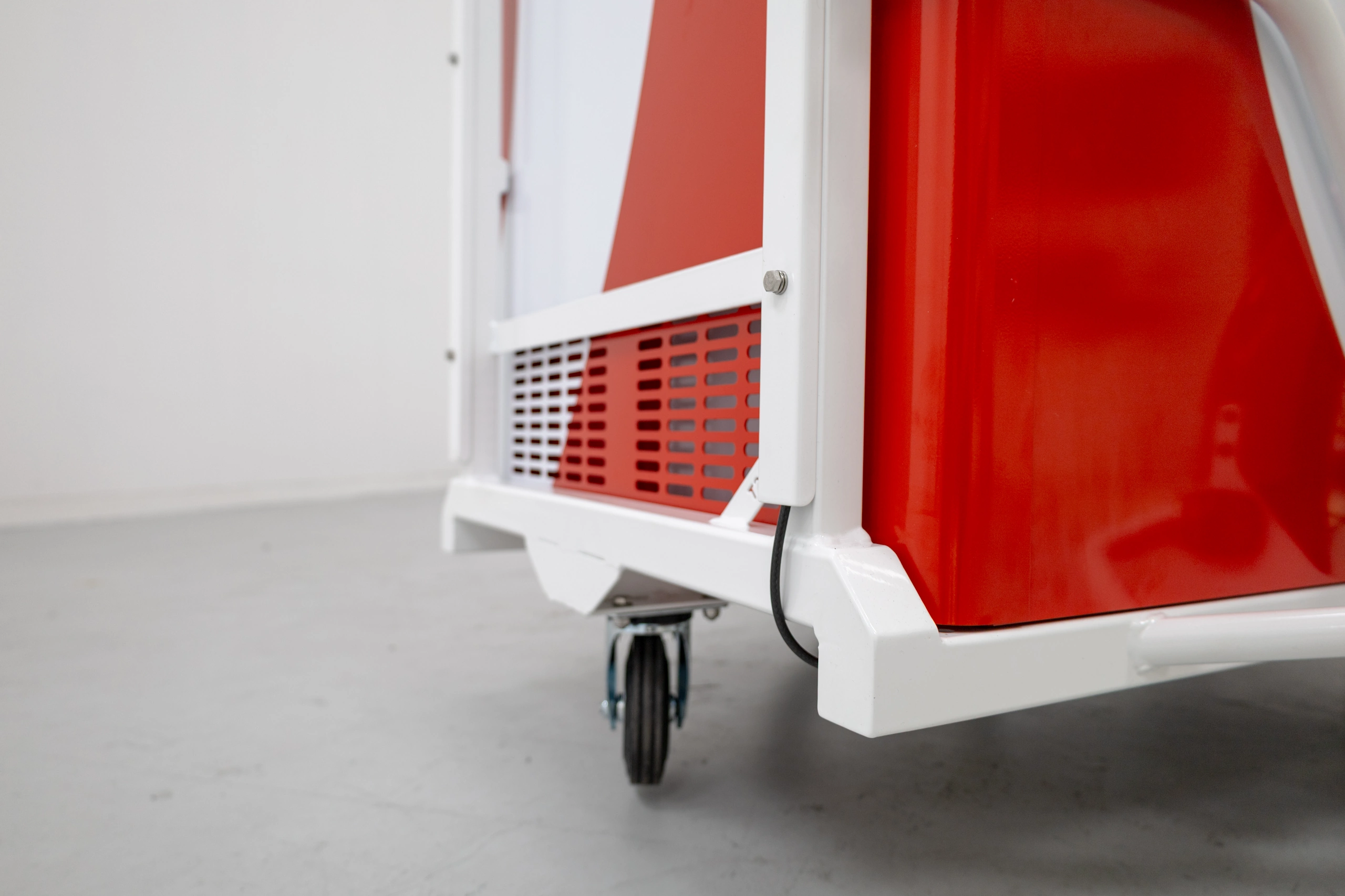 Het dakje is inschuifbaar met behulp van twee arreteerbouten aan het frame. Aan de voorzijde is een kastje geplaatst voor schoonmaakspullen.